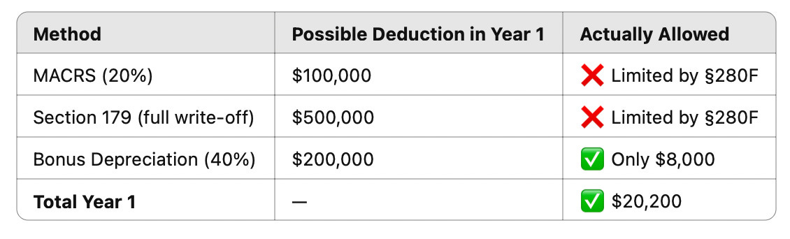 The bonus depreciation is capped at only $8,000 in Year 1 under §280F.