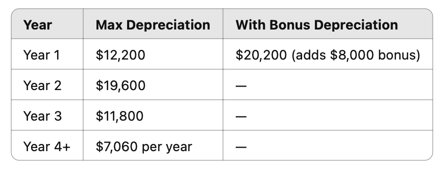 Fun fact: This is one of the main reasons why the Mercedes G-Wagon is so popular among high-income earners like Dr. Nip-Tuck. Since it weighs over 6,000 pounds, it’s not subject to §280F — making it fully eligible for Section 179 expensing and bonus depreciation.