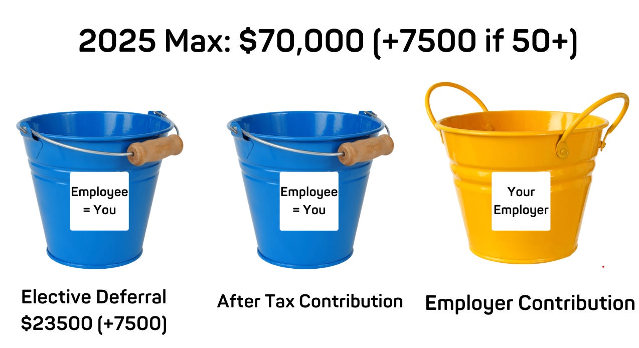 Elective Deferral: This bucket is filled with the employee’s pre-tax contributions, which are capped at $23,500 in 2025. By contributing to this bucket, your taxable income is ultimately reduced by the elective deferral amount for income tax purposes, allowing you to defer taxes on that portion of your earnings until withdrawal in retirement.