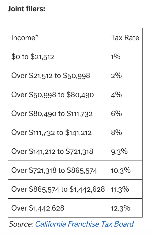 Note: California also assesses a 0.9% State Disability Insurance (SDI) tax, but it is not included here for simplicity.